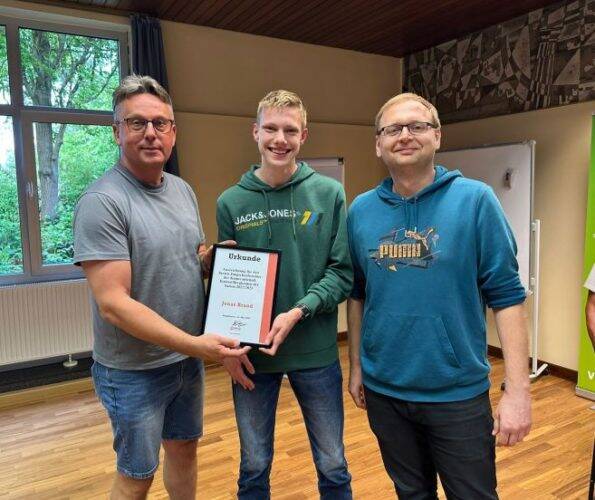 Bildzeile: Torsten Perschke (li.) und Chris Nielinger (re.) beglückwünschen Jonas Brand als Jungschiedsrichter des Jahres 2023.
